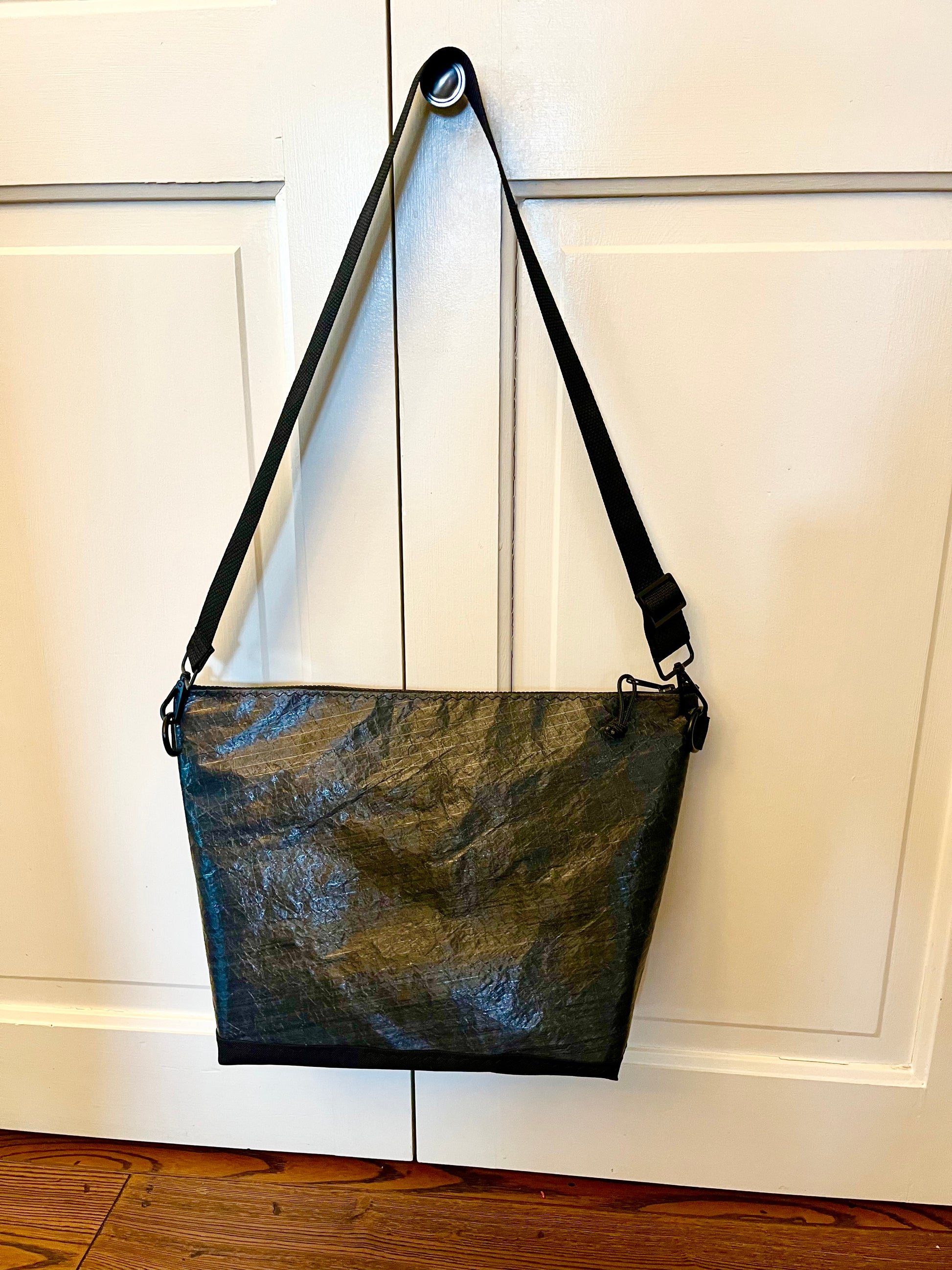 This black Crossbody bag made from a used carbon fiber sail and is the perfect size to hold essentials for work or any time. It measures 16" along the zipper x 11" high x 4" across the bottom. It has an adjustable 1.5" strap to hang at your desired length up to 19". This bag is made with two layers of used sail material to give it durability and stability and has four inside pockets.