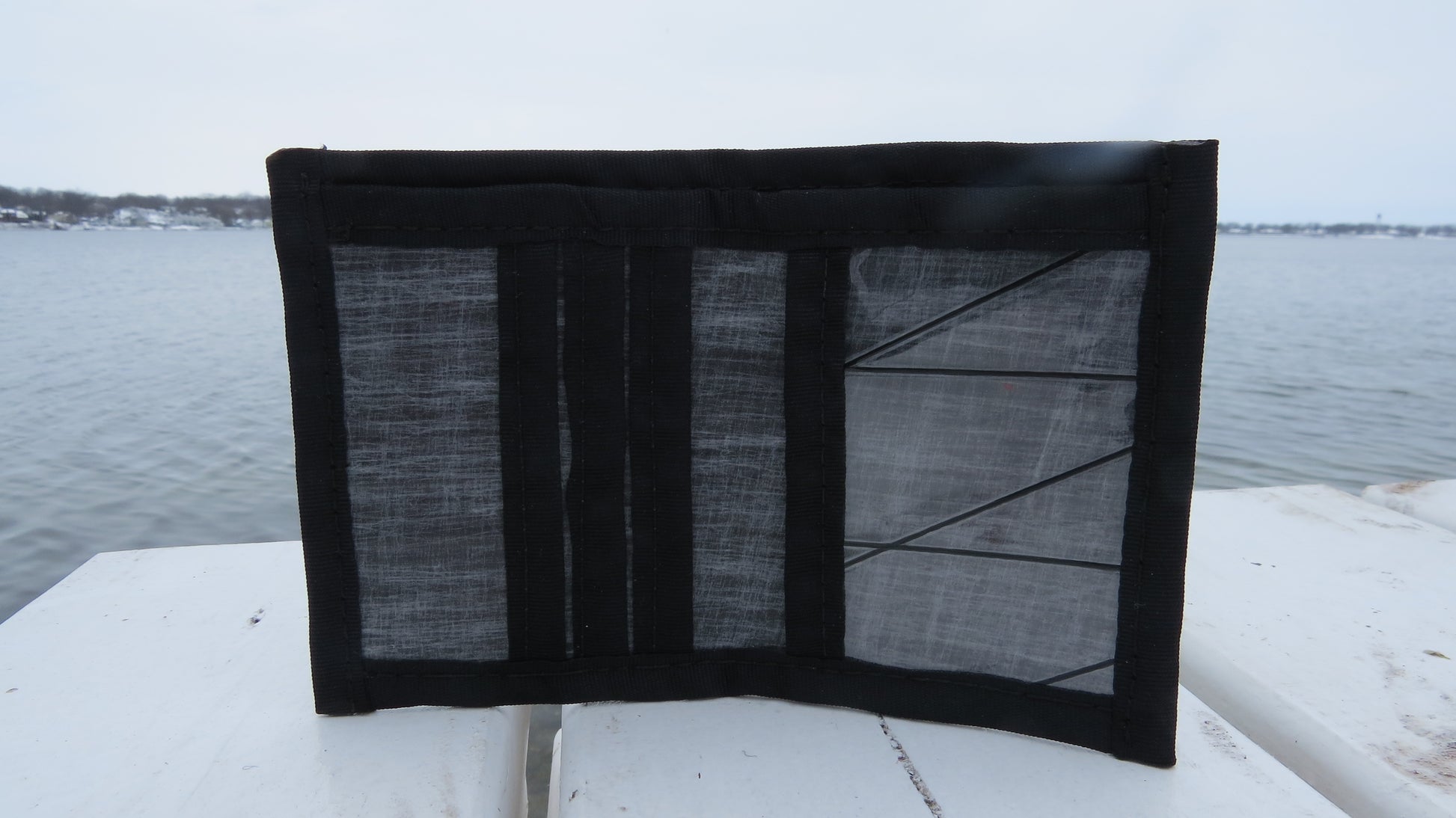 Many sails are now made with carbon fibers—the strongest load-carrying material in sails—and carbon is black.   This wallet is made from a used carbon-fiber sail giving this wallet a soft feel in your pocket while still very durable.