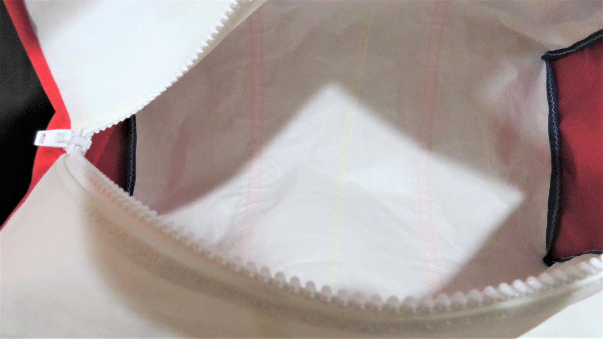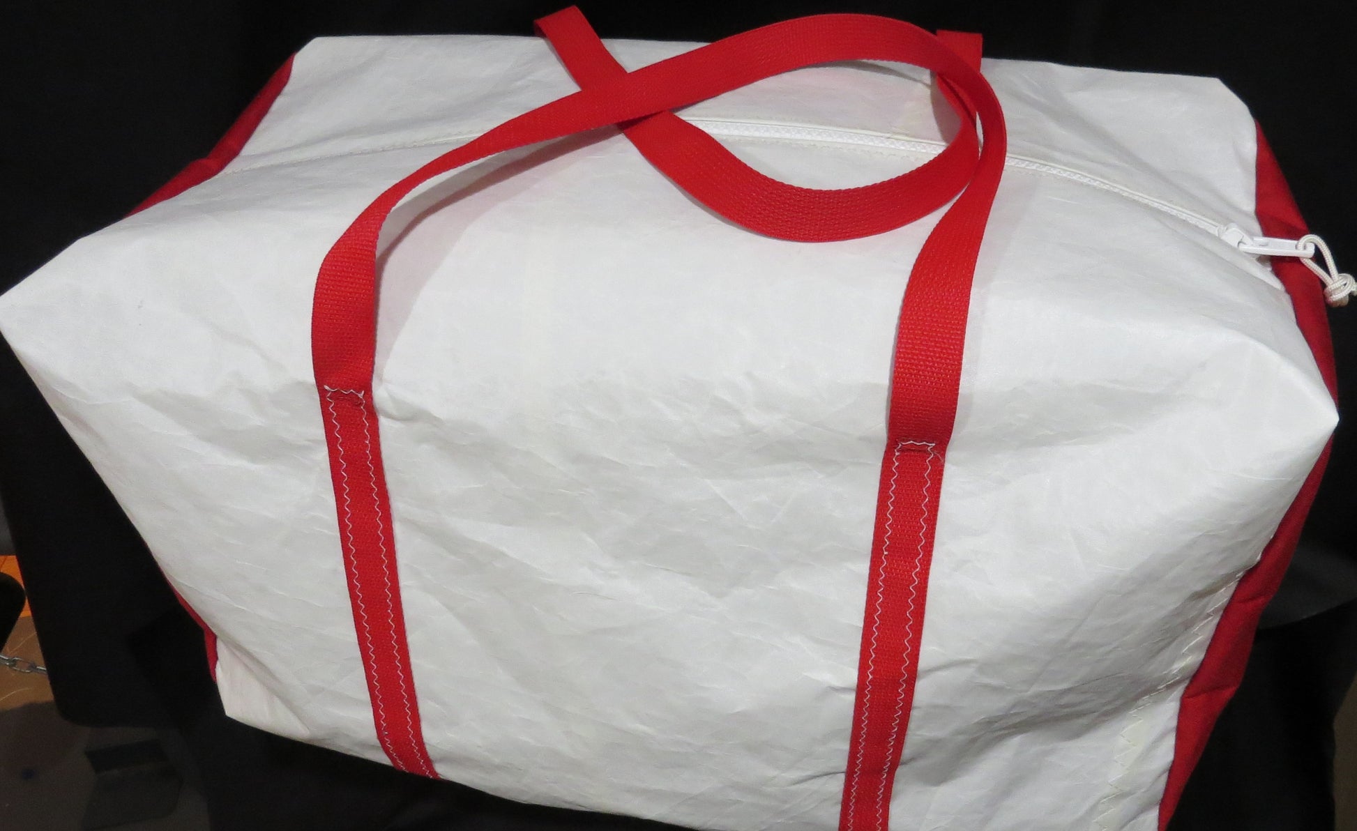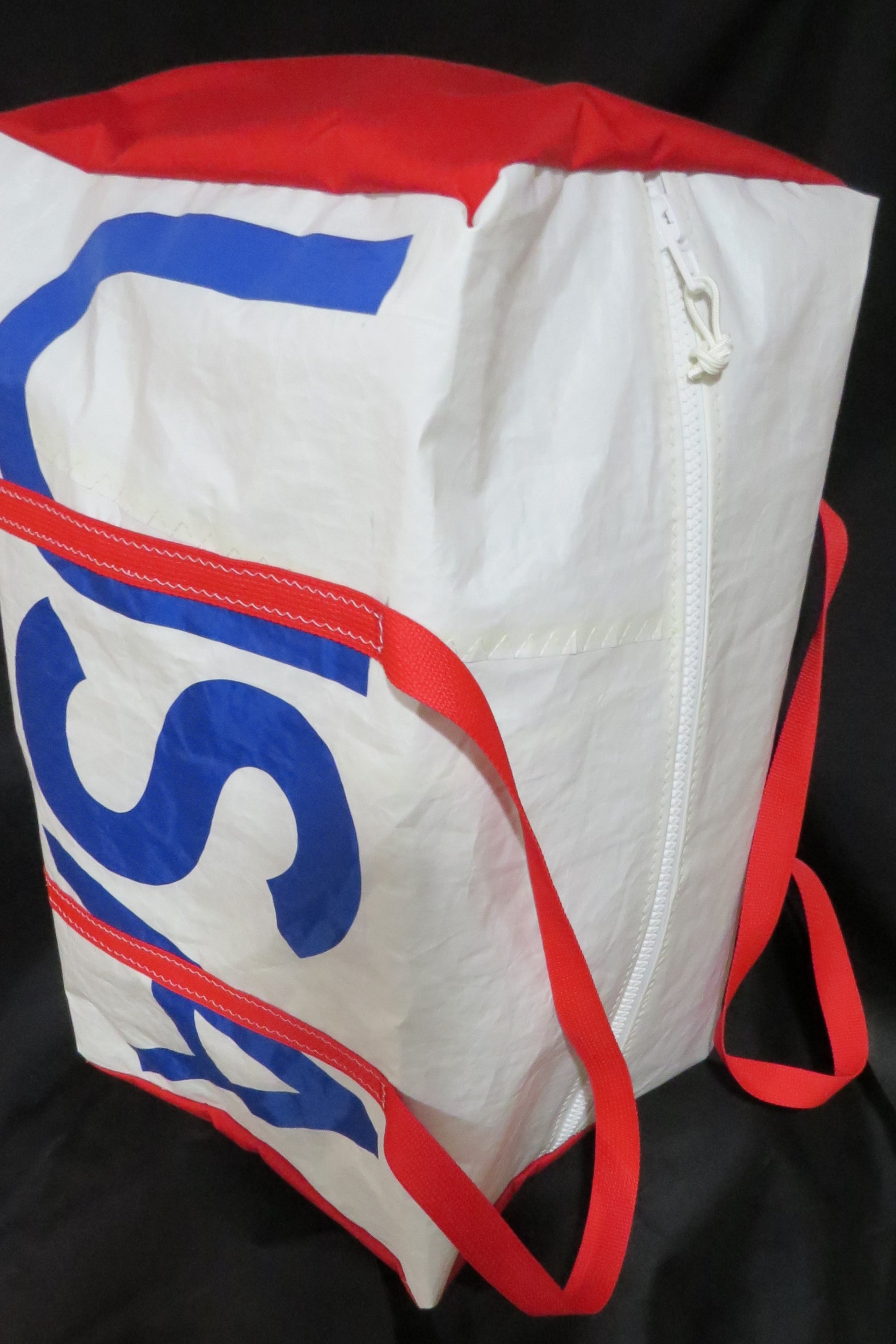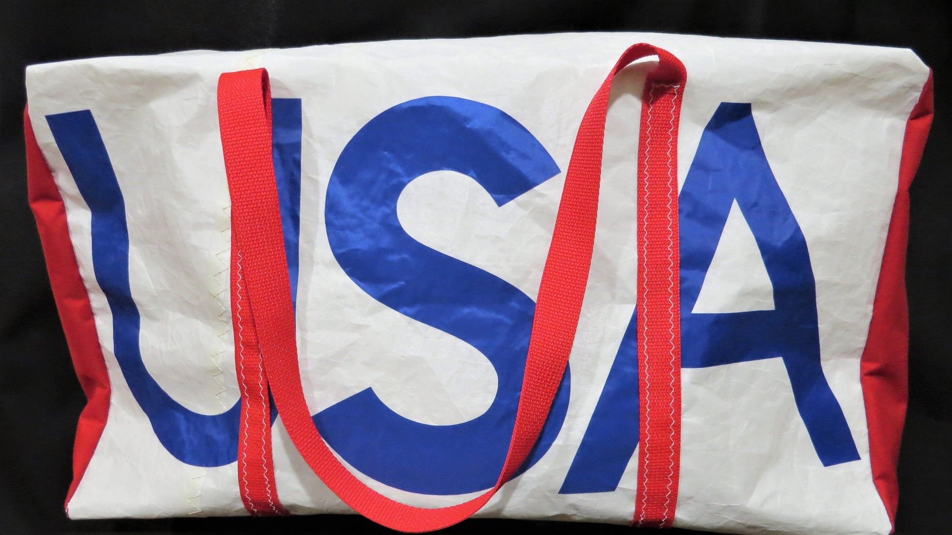 This Duffle Bag measures 23x13x11" and is made from Dacron sail material of a well-sailed C Scow. The bag aesthetically combines the blue USA text, red canvas sides with red straps and blue seam trim.