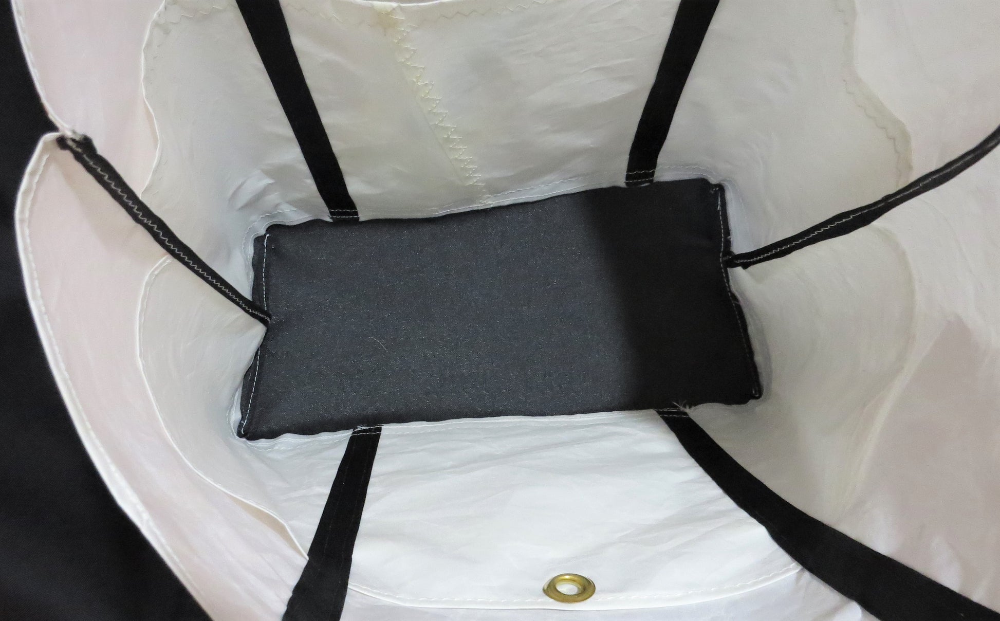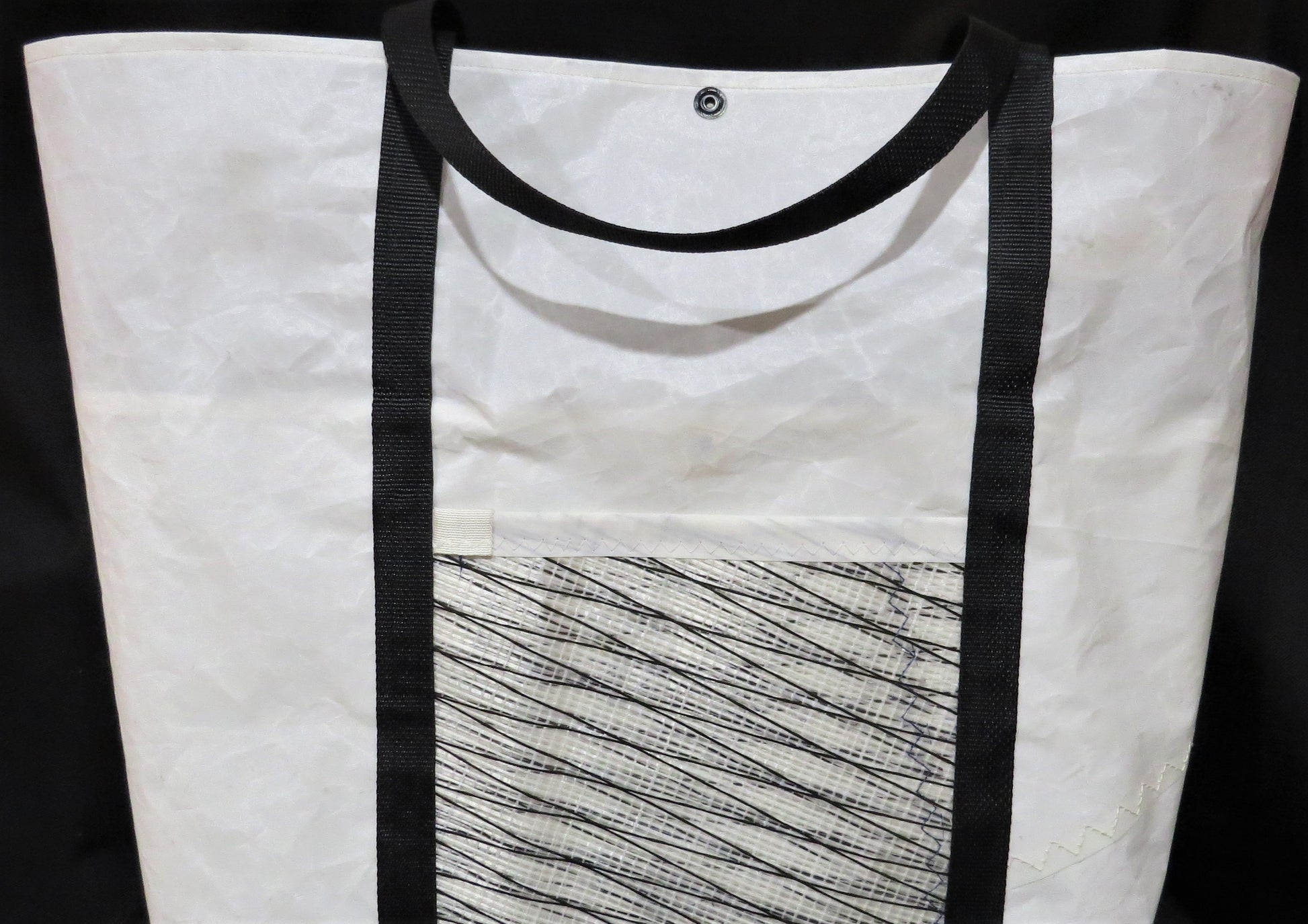 This Large Snap Sail Bag measures 24”x17”x10” and includes an actual C Scow sail batten. The bag aesthetically combines a black canvas bottom, black straps and black seam trim. The white sail material is Dacron cut from a well-sailed C Scow sail. The outside pocket is made from an E Scow jib sail.