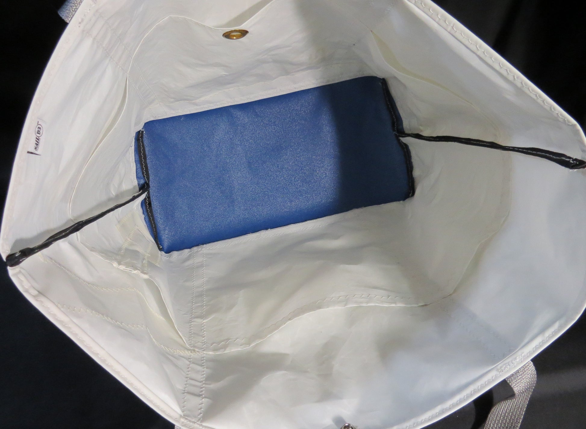 This No. 11 Sail Bag measures 24”x17”x10” and aesthetically combines the black sail number text with a blue canvas bottom, gray straps and black seam trim. The white sail material is Dacron cut from a well-sailed C Scow sail. The outside pocket is made from an E Scow jib sail. The No. 11 is cut from authentic adhesive backed cloth used to make sail numbers and logos.
