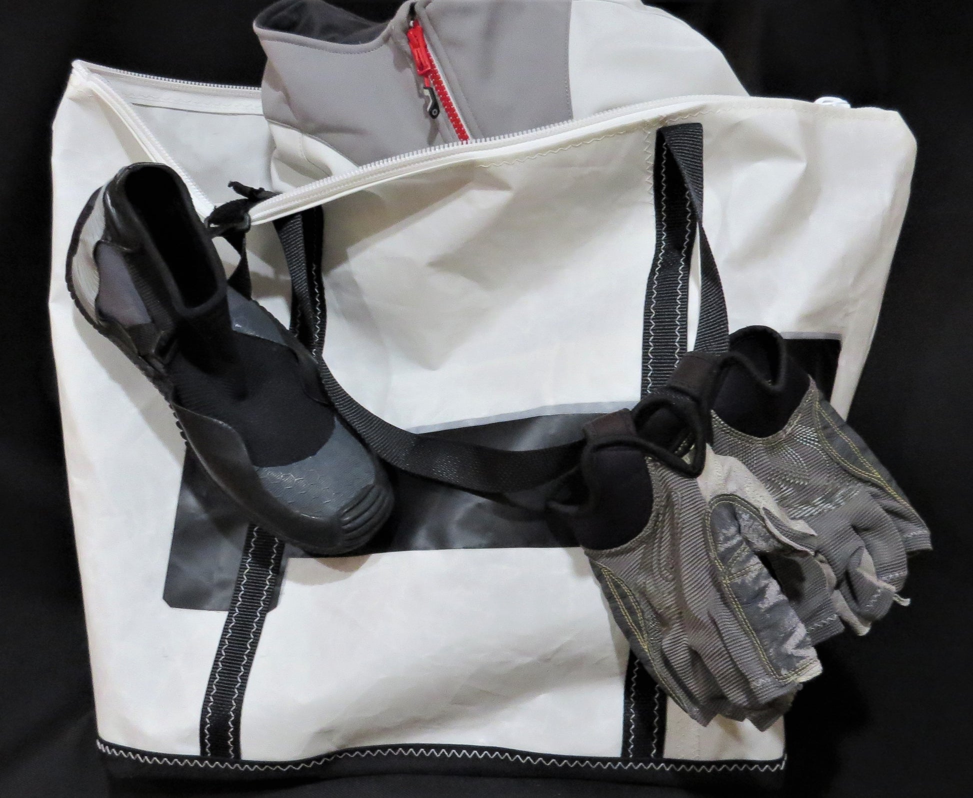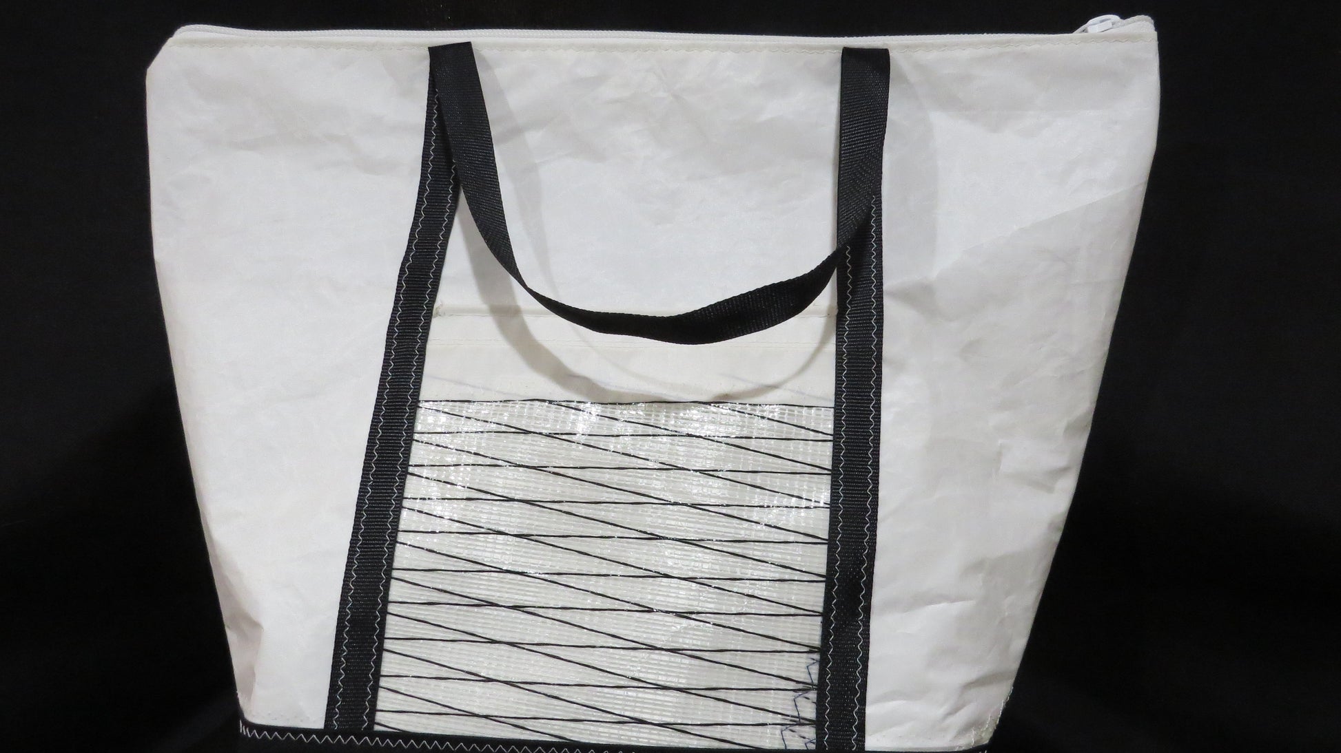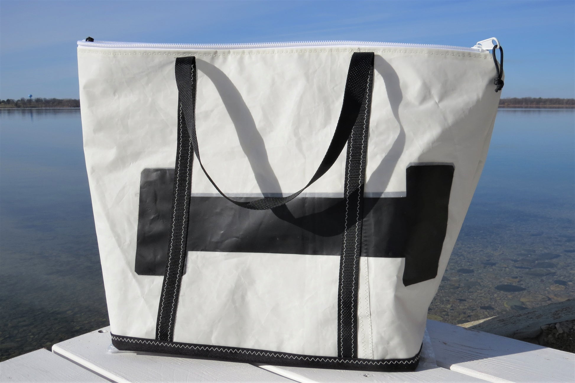 This letter I Sail Bag measures 24”x17”x10” and aesthetically combines black sail designation text, a black canvas bottom with black straps and black seam trim. The white sail material is Dacron cut from a well-sailed C Scow sail. The outside pocket is Mylar from an E Scow jib. The letter I is the authentic designation on this particular main sail.