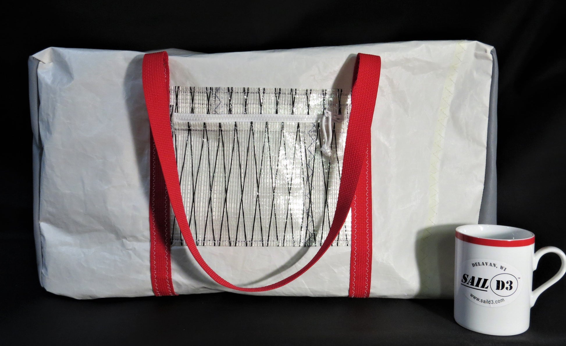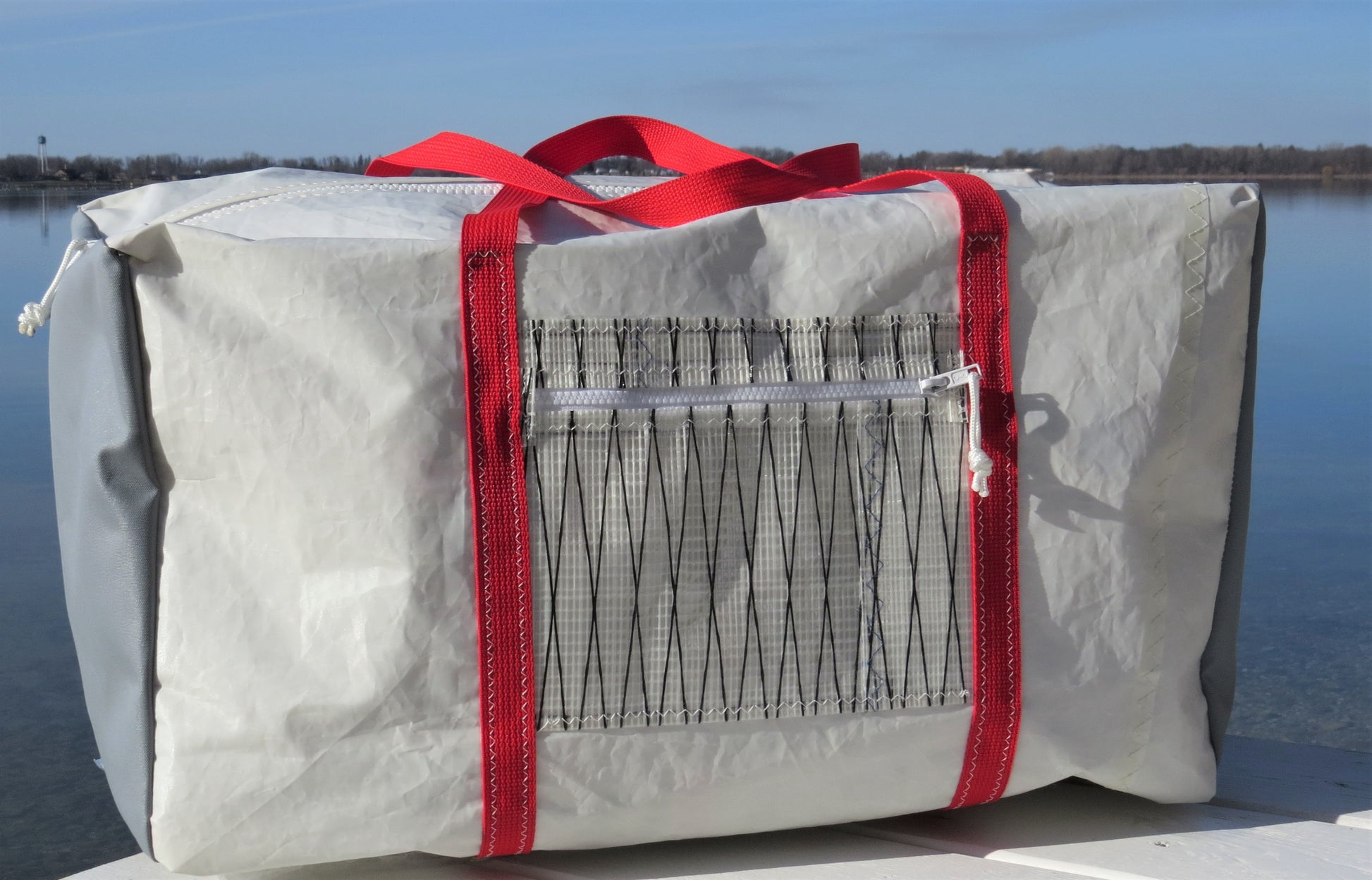This No. 2 Duffle Bag measures 23x13x11" and is made from Dacron sail material of a well-sailed C Scow. The bag aesthetically combines the blue 2 text, gray canvas sides with red straps and blue seam trim. The pocket on the back is made from a Mylar E Scow jib and includes a zipper to close. The number 2 is cut from authentic adhesive backed cloth used to make sail numbers and logos.