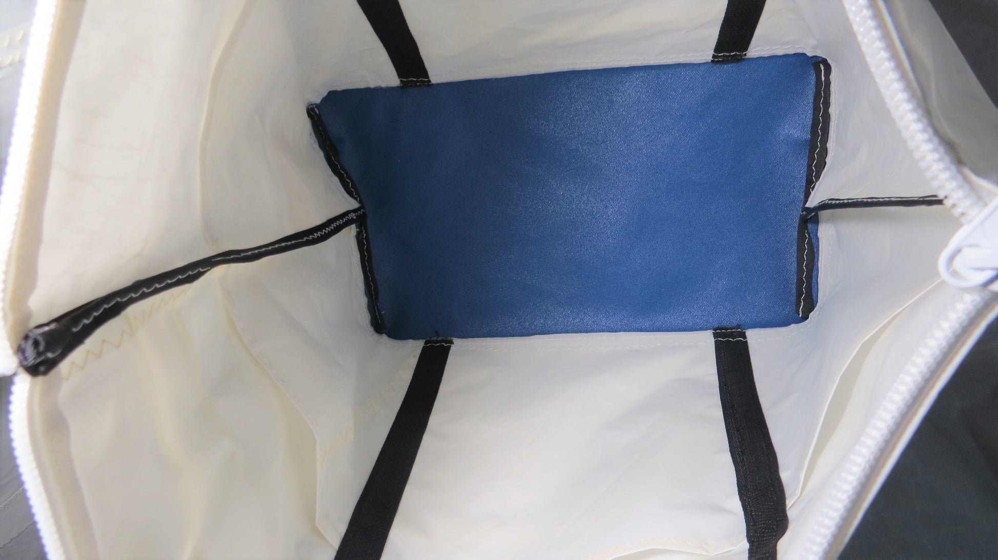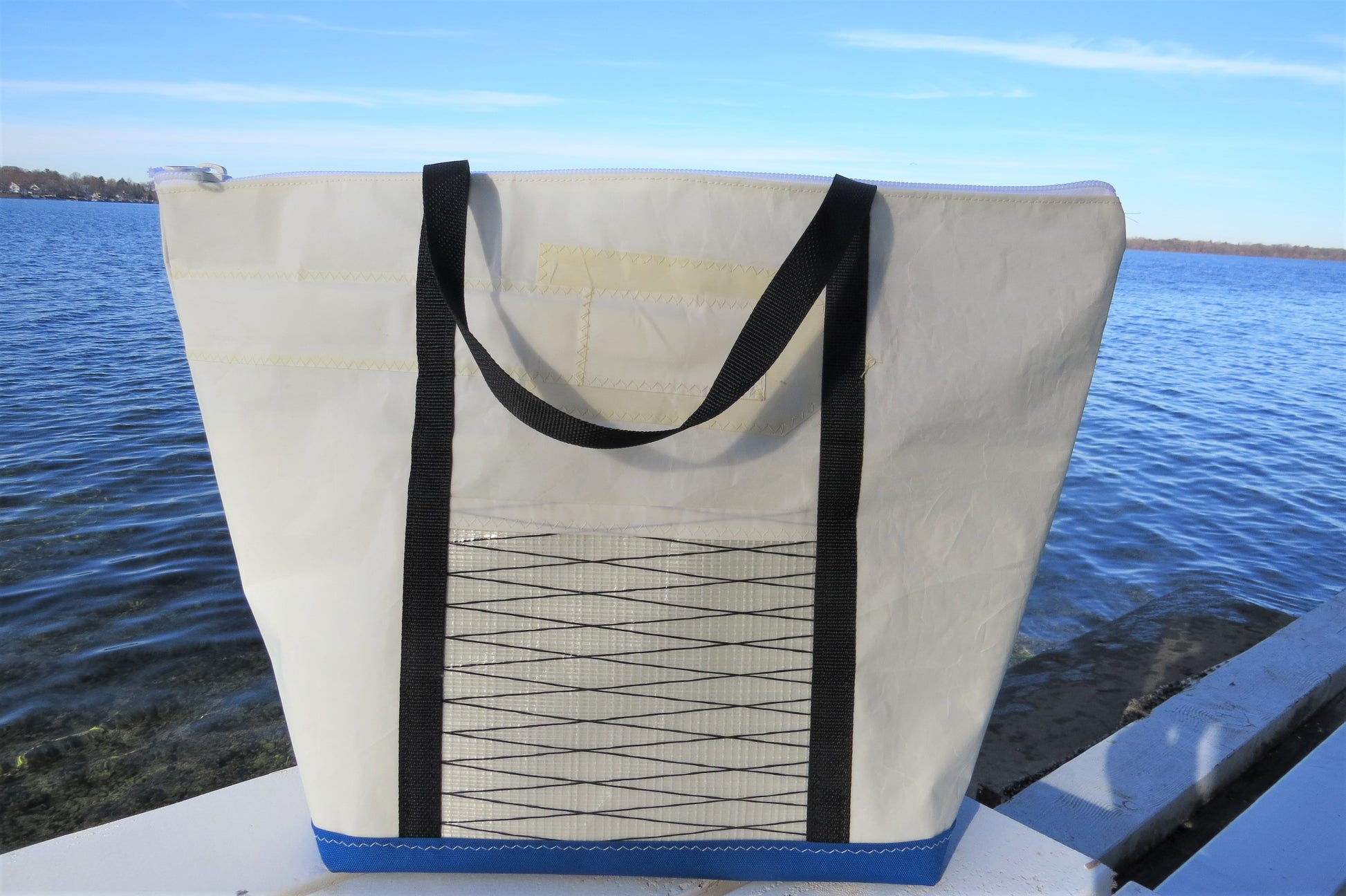 This No. 3 Sail Bag measures 24”x17”x10” and aesthetically combines blue sail number text, a blue canvas bottom with black straps and black seam trim. The white sail material is Dacron cut from a well-sailed C Scow sail. The outside pocket is Mylar from an E Scow jib. The No. 3 is cut from authentic adhesive backed cloth used to make sail numbers and logos.