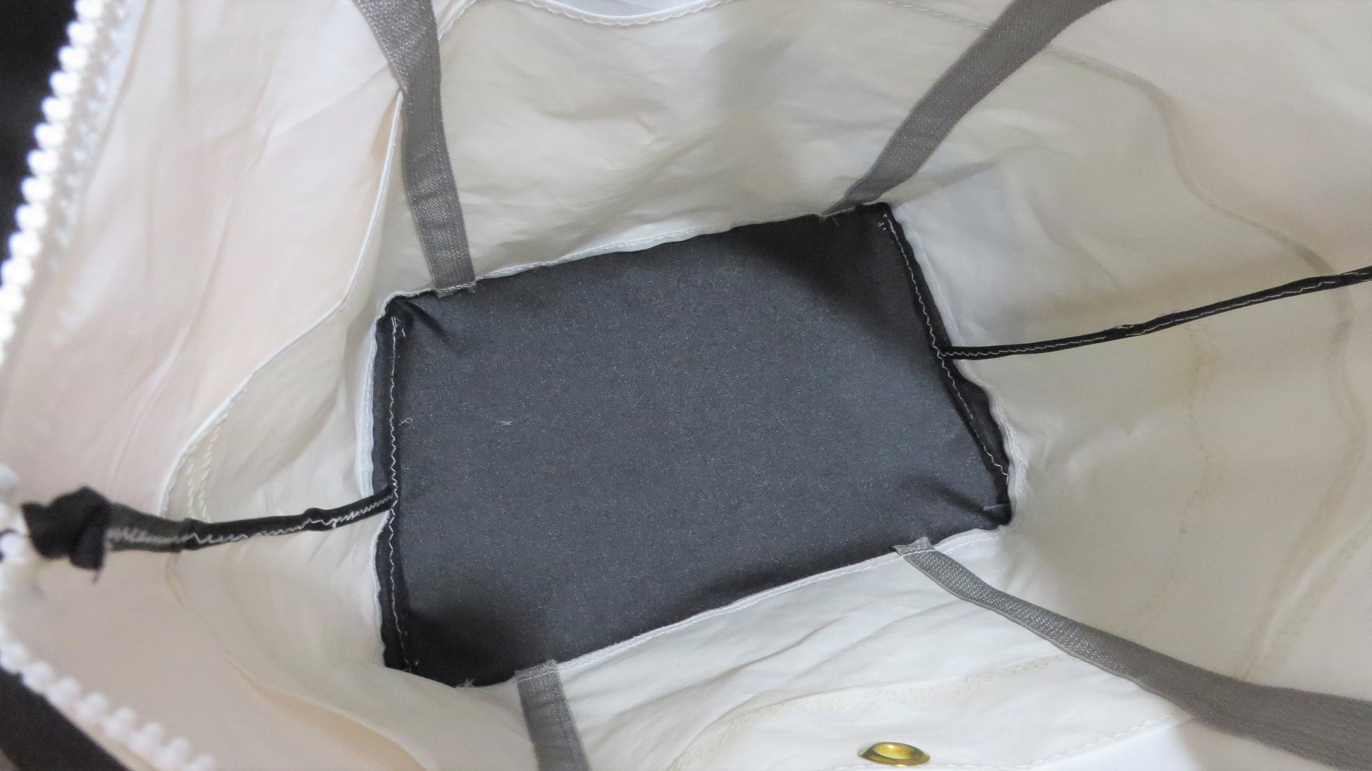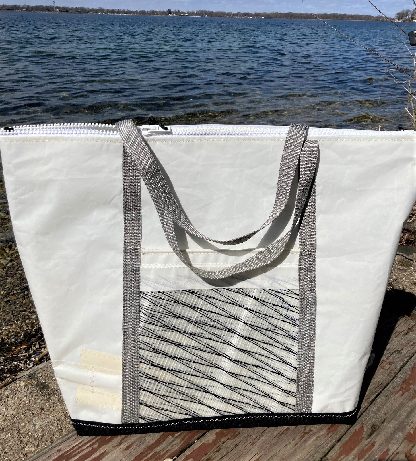 This No. 7 Sail Bag measures 24”x17”x10” and aesthetically combines the blue sail number text with a black canvas bottom, gray straps and black seam trim. The white sail material is Dacron cut from a well-sailed C Scow sail. The outside pocket is made from an E Scow jib sail. The No. 7 is cut from authentic adhesive backed cloth used to make sail numbers and logos.