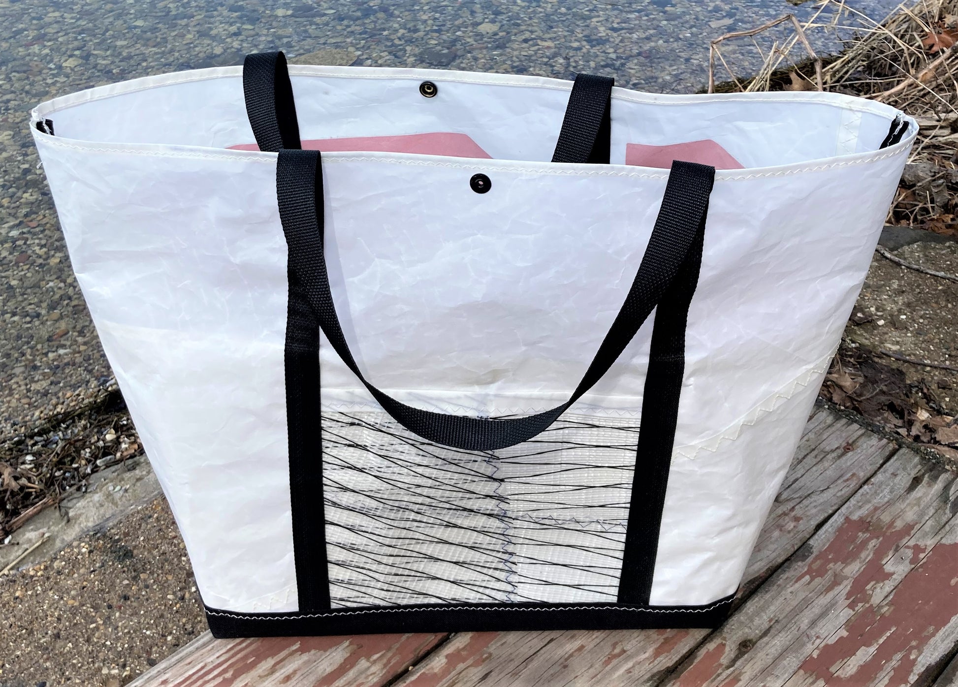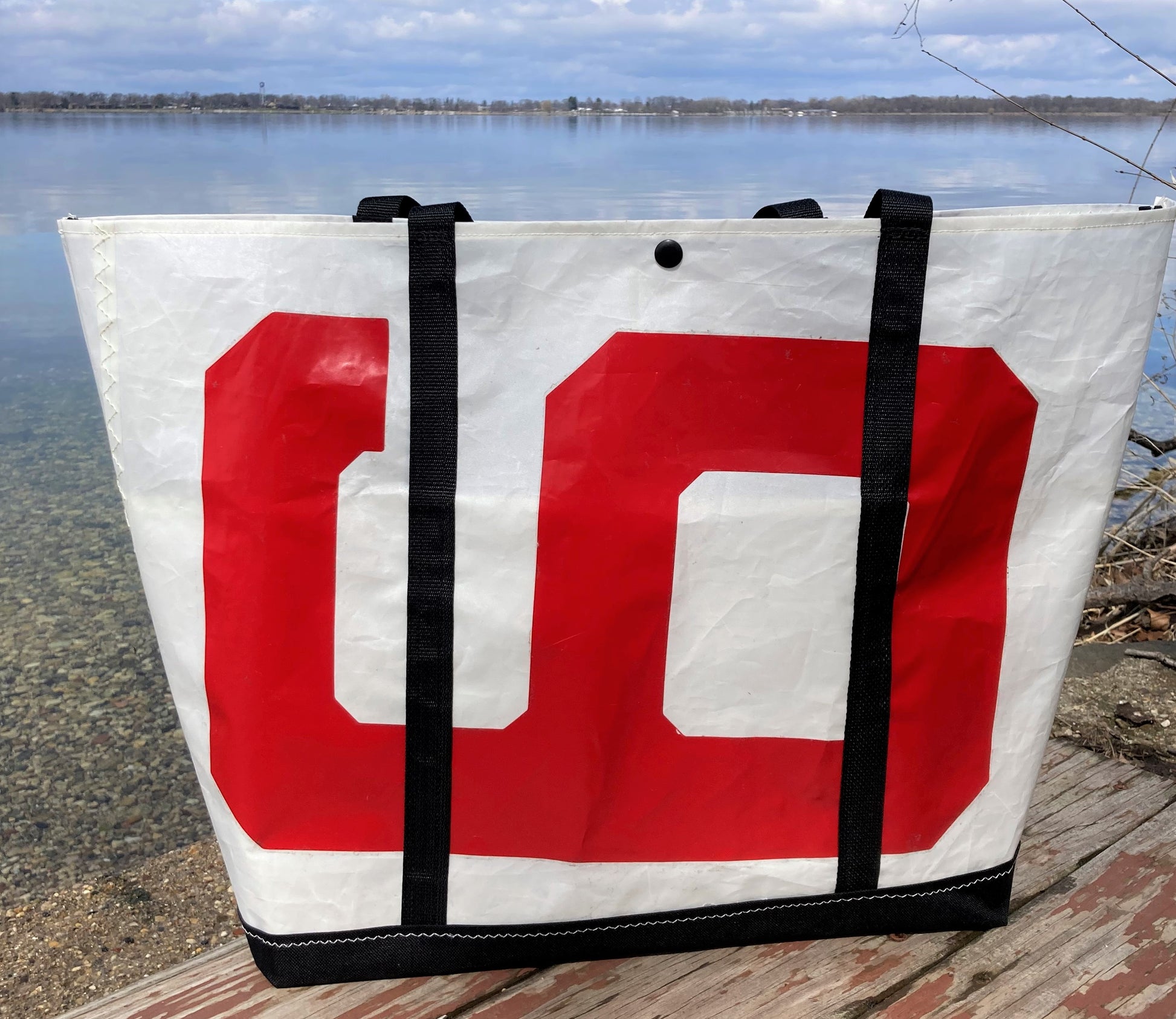 This No. 9 Sail Bag measures 24”x17”x10” and aesthetically combines the red sail number text, with a black canvas bottom, black straps and black seam trim. The white sail material is Dacron cut from a well-sailed C Scow sail. The outside pocket is Mylar from an E Scow jib. The No. 9 is the authentic number on this particular C Scow sail.