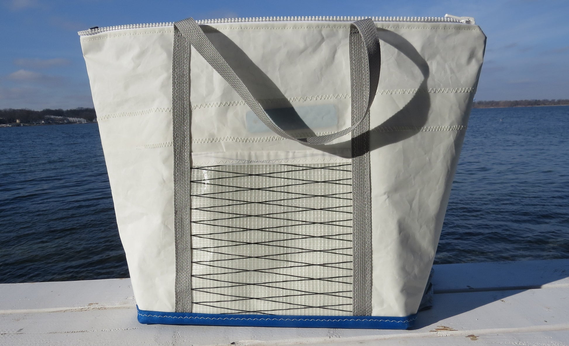 This No. 4 Sail Bag measures 24”x17”x10” and aesthetically combines blue sail number text, a blue canvas bottom with gray straps and black seam trim. The white sail material is Dacron cut from a well-sailed C Scow sail. The outside pocket is Mylar from an E Scow jib. The No. 4 is cut from authentic adhesive backed cloth used to make sail numbers and logos.