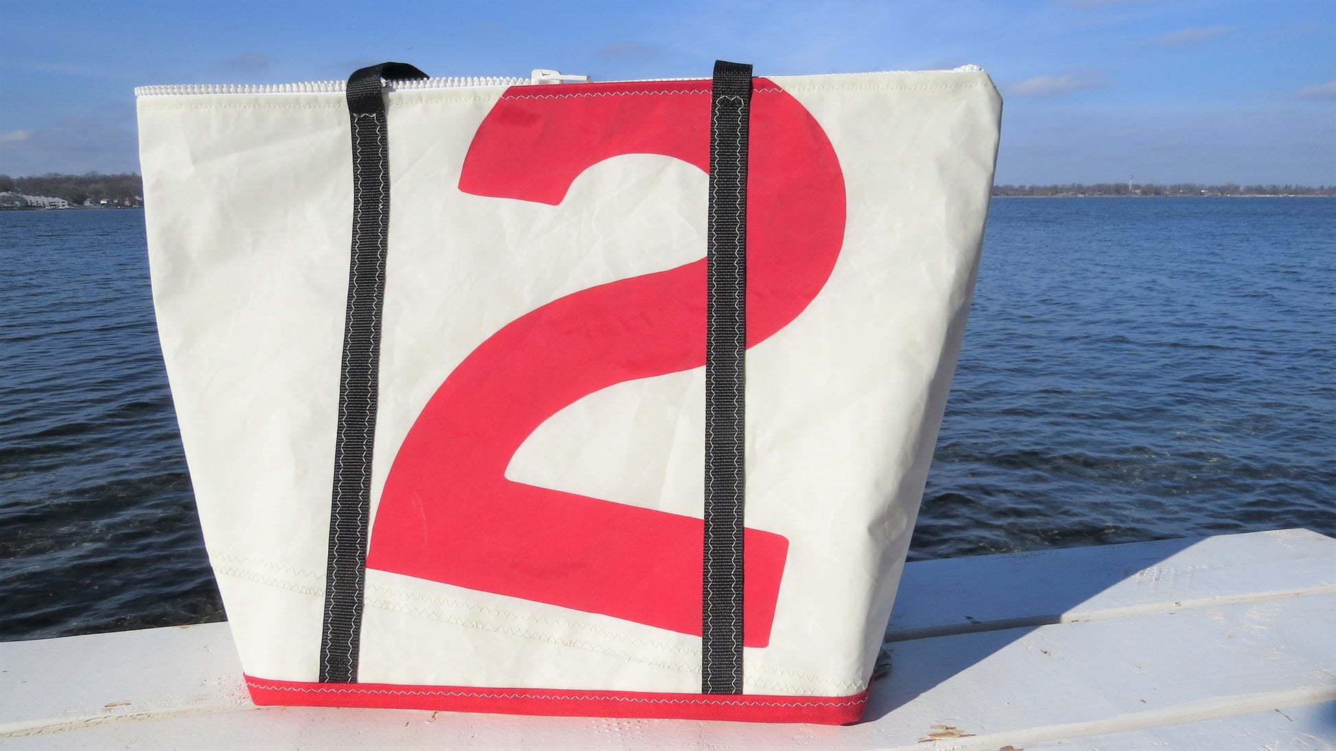 This No. 2 Sail Bag measures 24”x17”x10” and aesthetically combines red sail number text, a red canvas bottom with black straps and black seam trim. The white sail material is Dacron cut from a well-sailed C Scow sail. The outside pocket is Mylar from an E Scow jib. The No. 2 is cut from authentic adhesive backed cloth used to make sail numbers and logos.