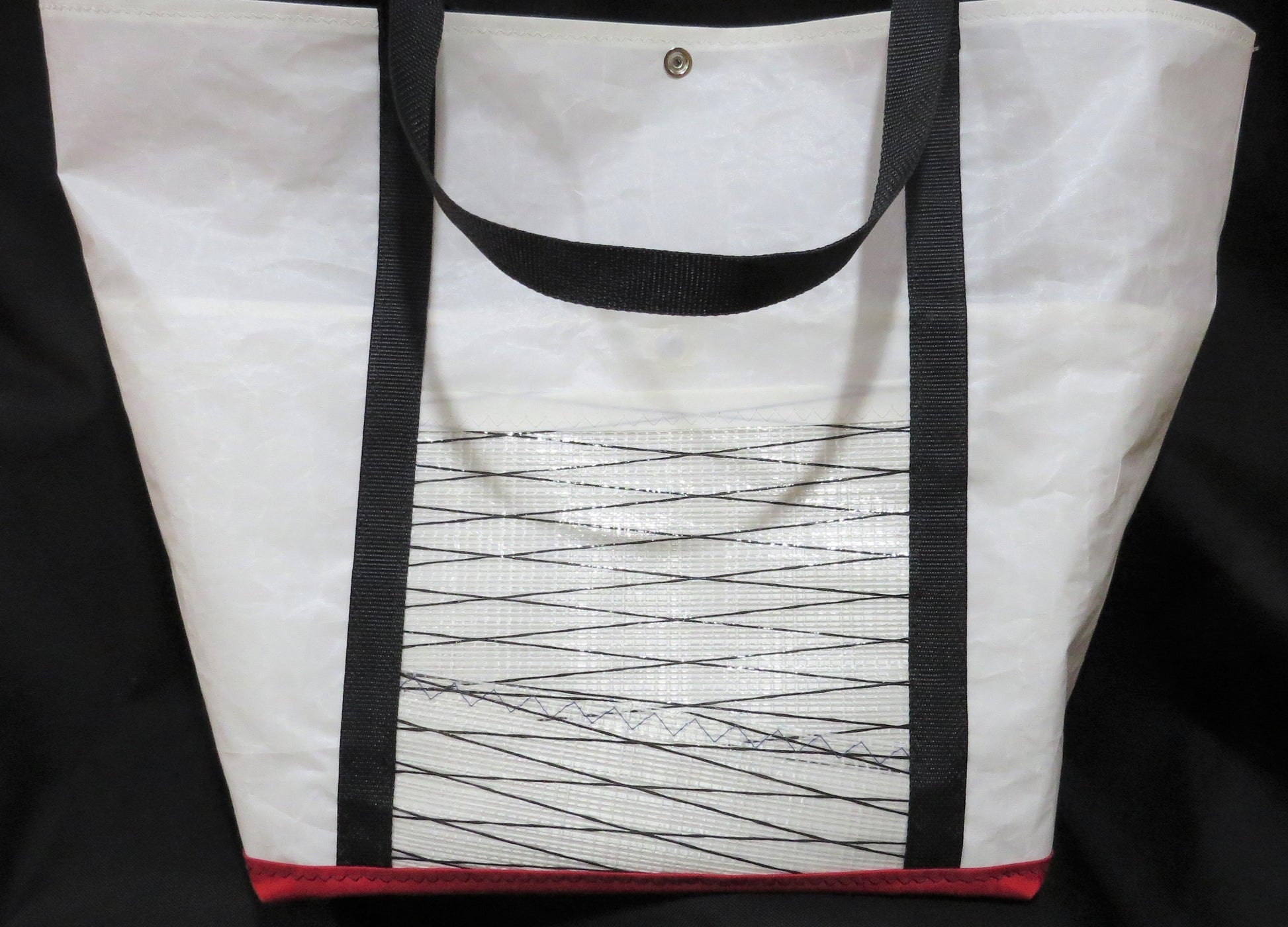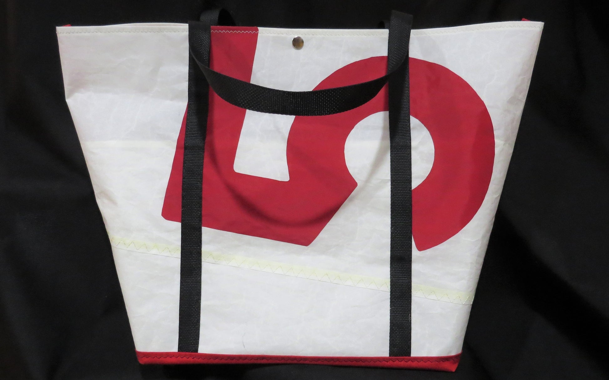 This No. 5 Sail Bag measures 24”x17”x10” and aesthetically combines the red sail number text with a red canvas bottom, black straps and black seam trim. The white sail material is Dacron cut from a well-sailed C Scow sail. The outside pocket is made from an E Scow jib sail. The No. 5 is cut from authentic adhesive backed cloth used to make sail numbers and logos.