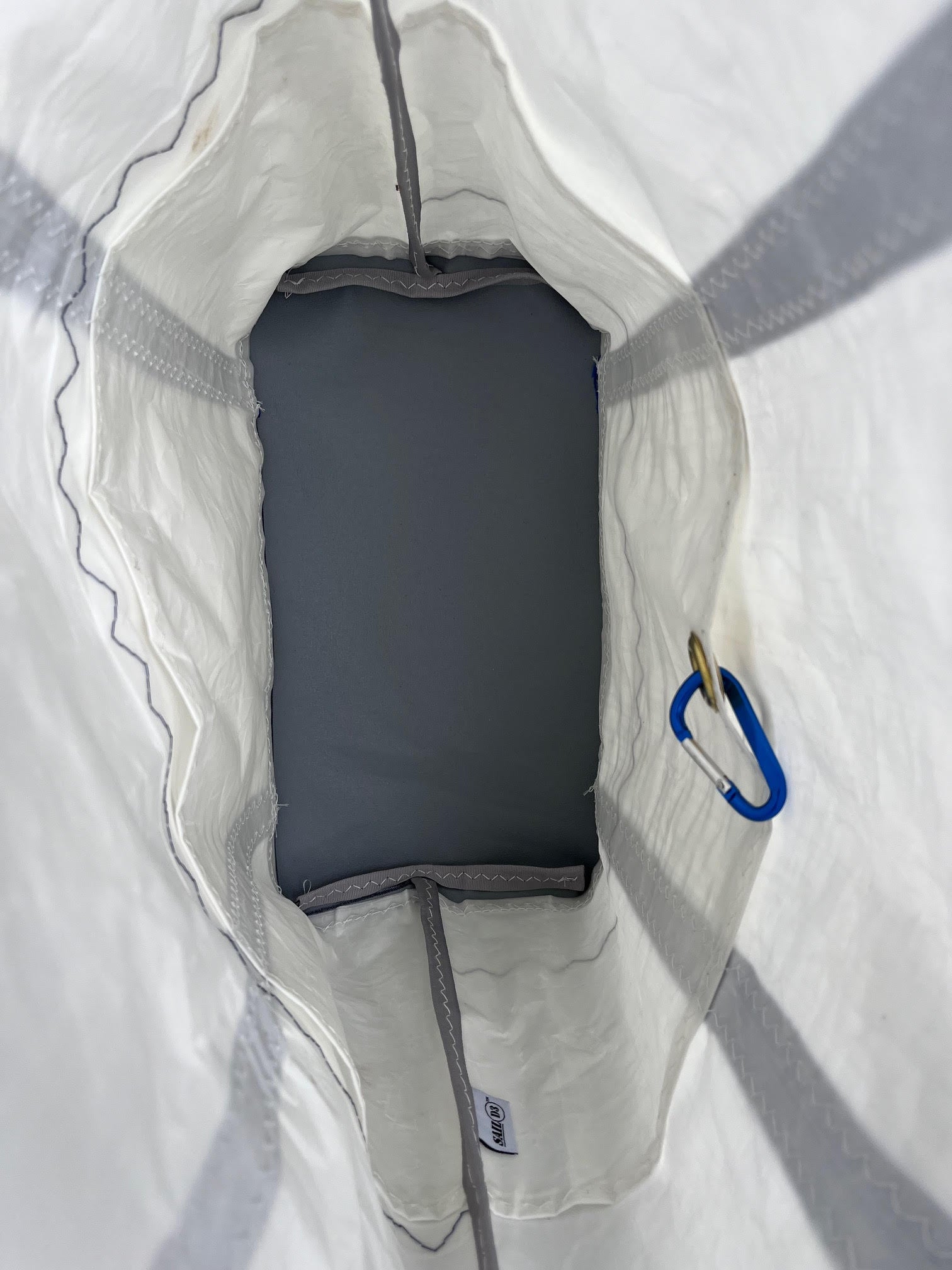The Double Pocket Sail Bag measures 19”x15”x7”. We put two outside pockets made from an E Scow jib on this bag along with a gray canvas bottom, blue straps and gray seam trim. The white sail material is Dacron cut from a well-sailed C Scow sail.