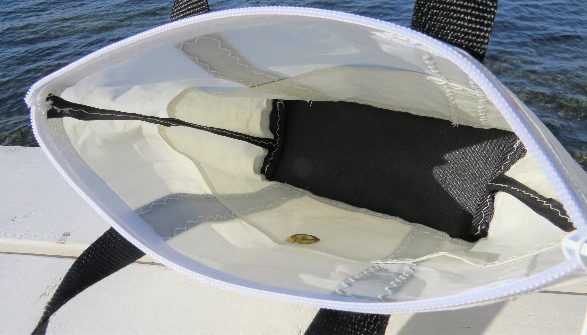 This Small Black Tote Bag measures 12”x8”x4” and aesthetically combines a black canvas bottom with black straps and black seam trim. The white sail material is Dacron cut from a well-sailed C Scow sail.