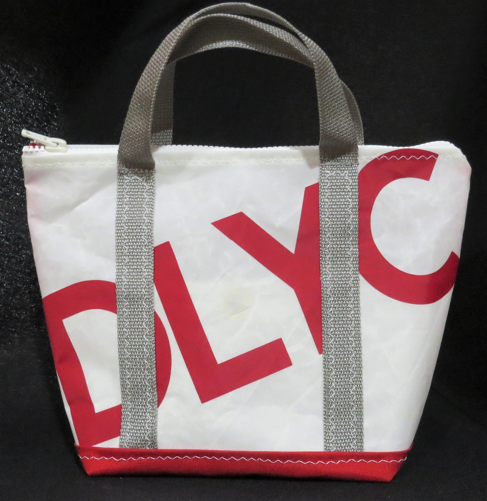 This Small Red DLYC and Delavan Lake Tote Bag measures 12”x8”x4” and aesthetically combines red DLYC text and Delavan Lake image, a red canvas bottom with gray straps and red seam trim. The white sail material is Dacron cut from a well-sailed C Scow sail. The DLYC and Lake image are cut from authentic adhesive backed cloth used to make sail numbers and logos