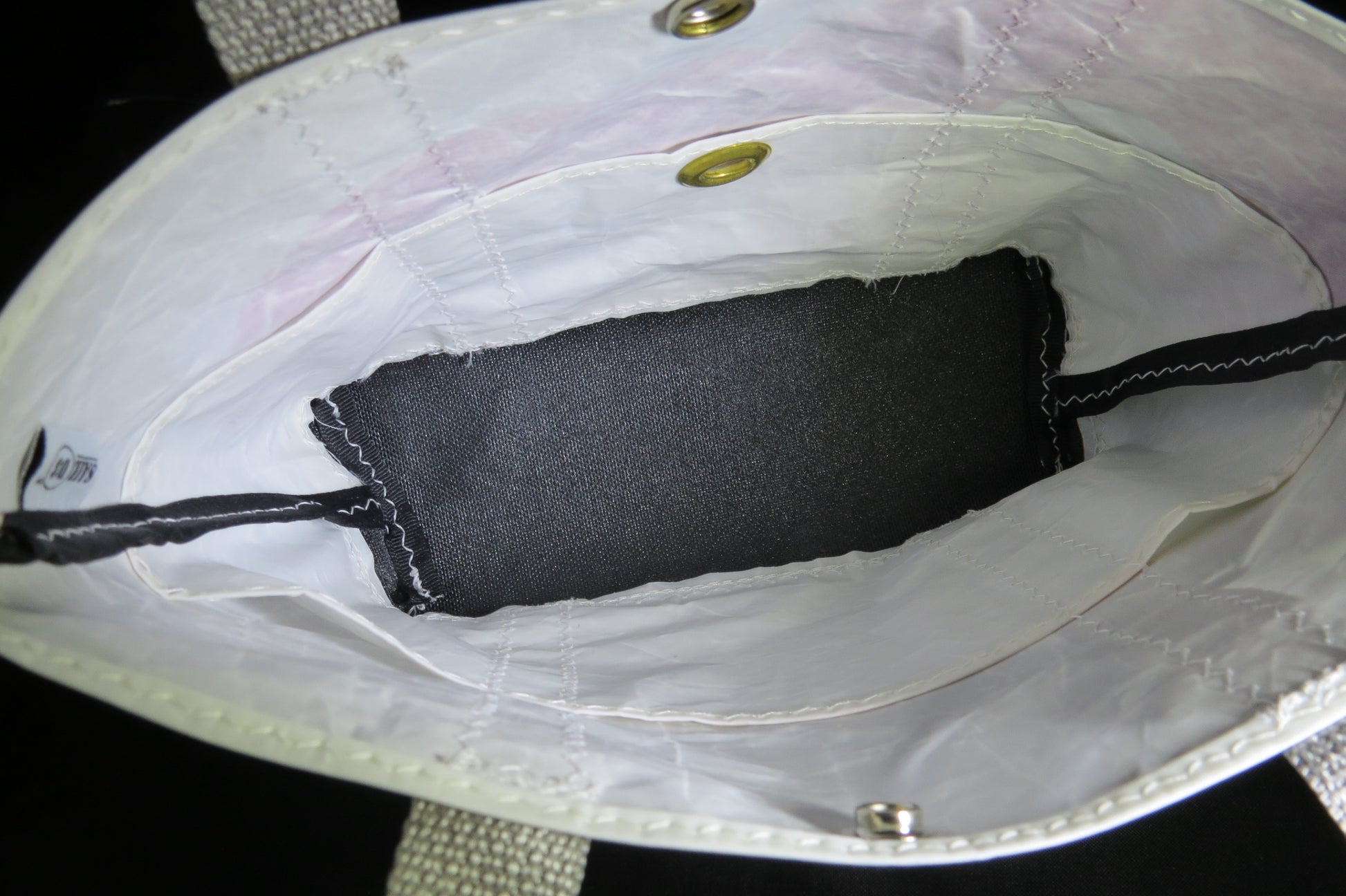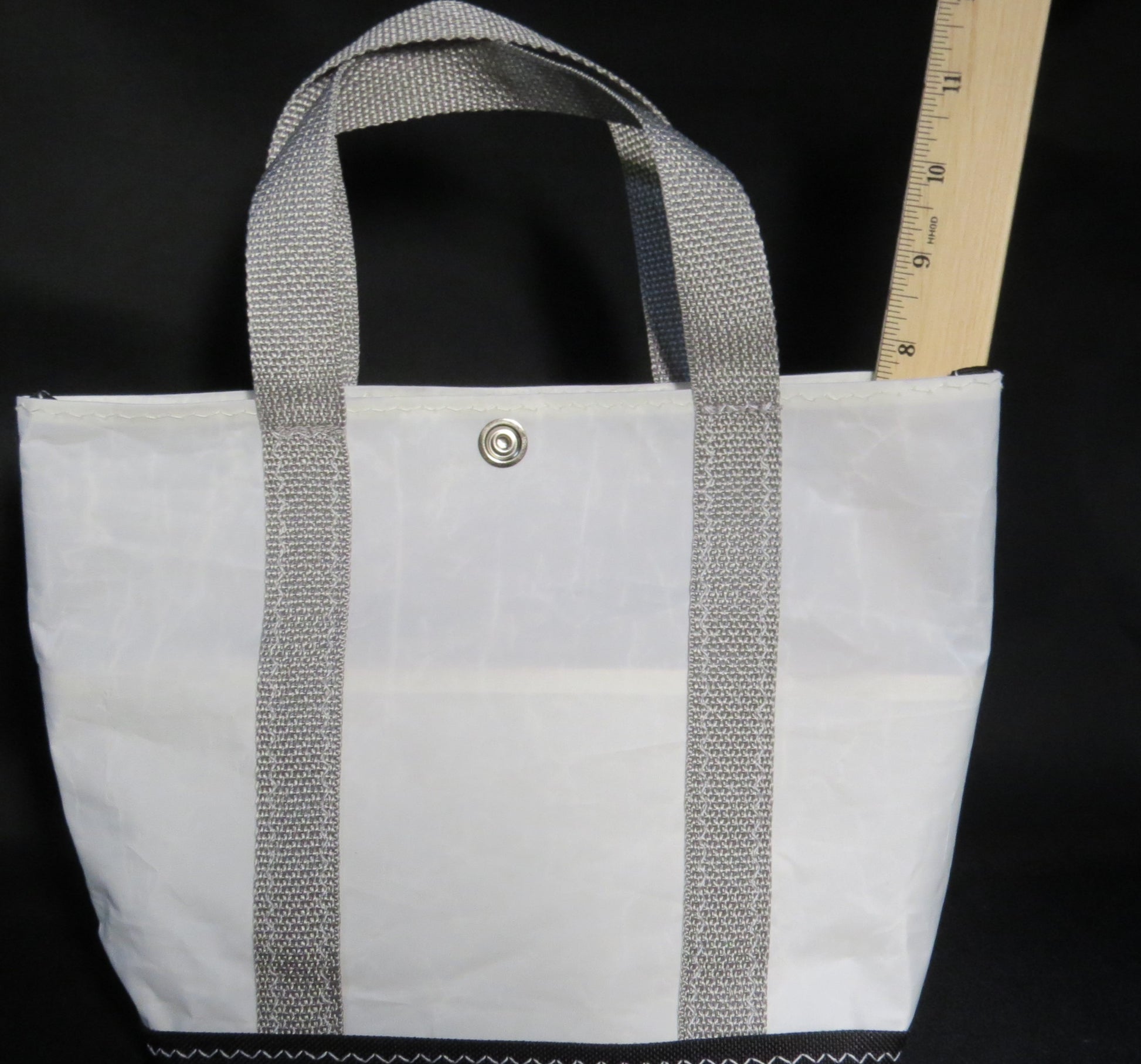 This Small No. 8 Tote Bag measures 12”x8”x4” and aesthetically combines red 8 sail number text, a black canvas bottom with gray straps and black seam trim. The white sail material is Dacron cut from a well-sailed C Scow sail. The No. 8 is cut from authentic adhesive backed cloth used to make sail numbers and logos.