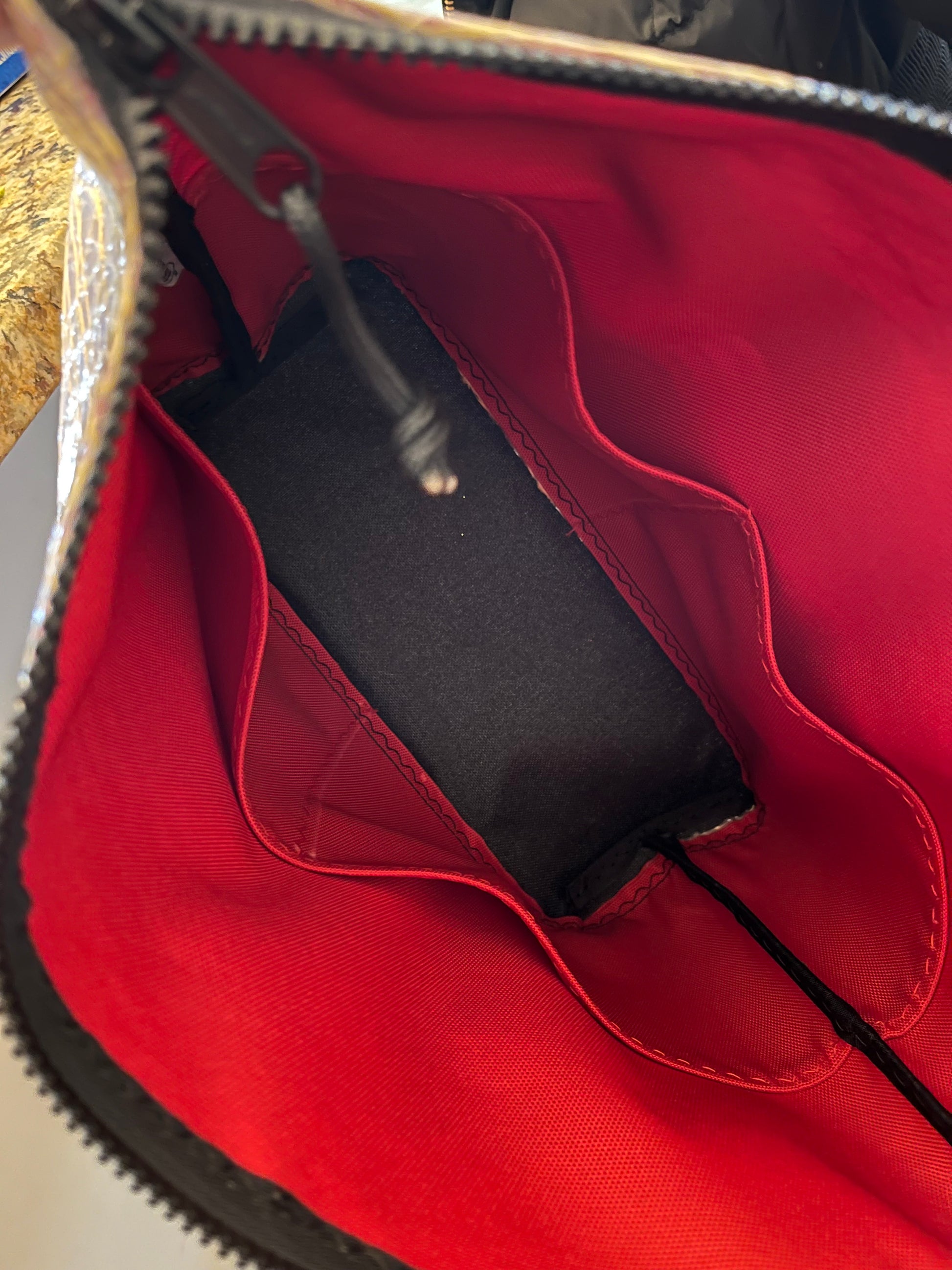 This unique Crossbody bag is made from a Melges 20 sail. It is the perfect size to hold essentials for work or any time. It measures 16" along the zipper x 11" high x 4" across the bottom. It has an adjustable 1.5" strap to hang at your desired length up to 19". The red inner lining and black bottom are both made from marine canvas. This bag has four inside pockets.