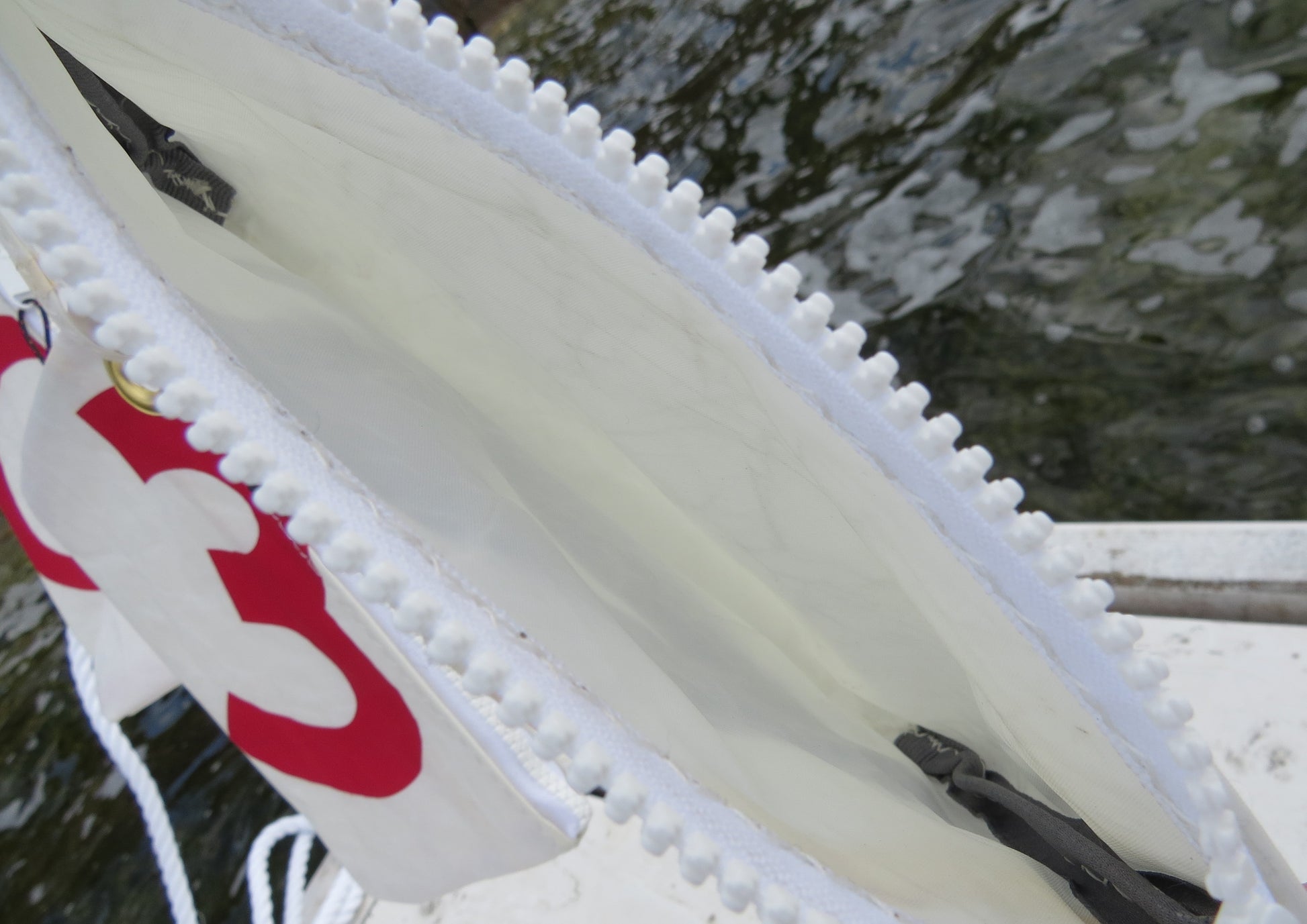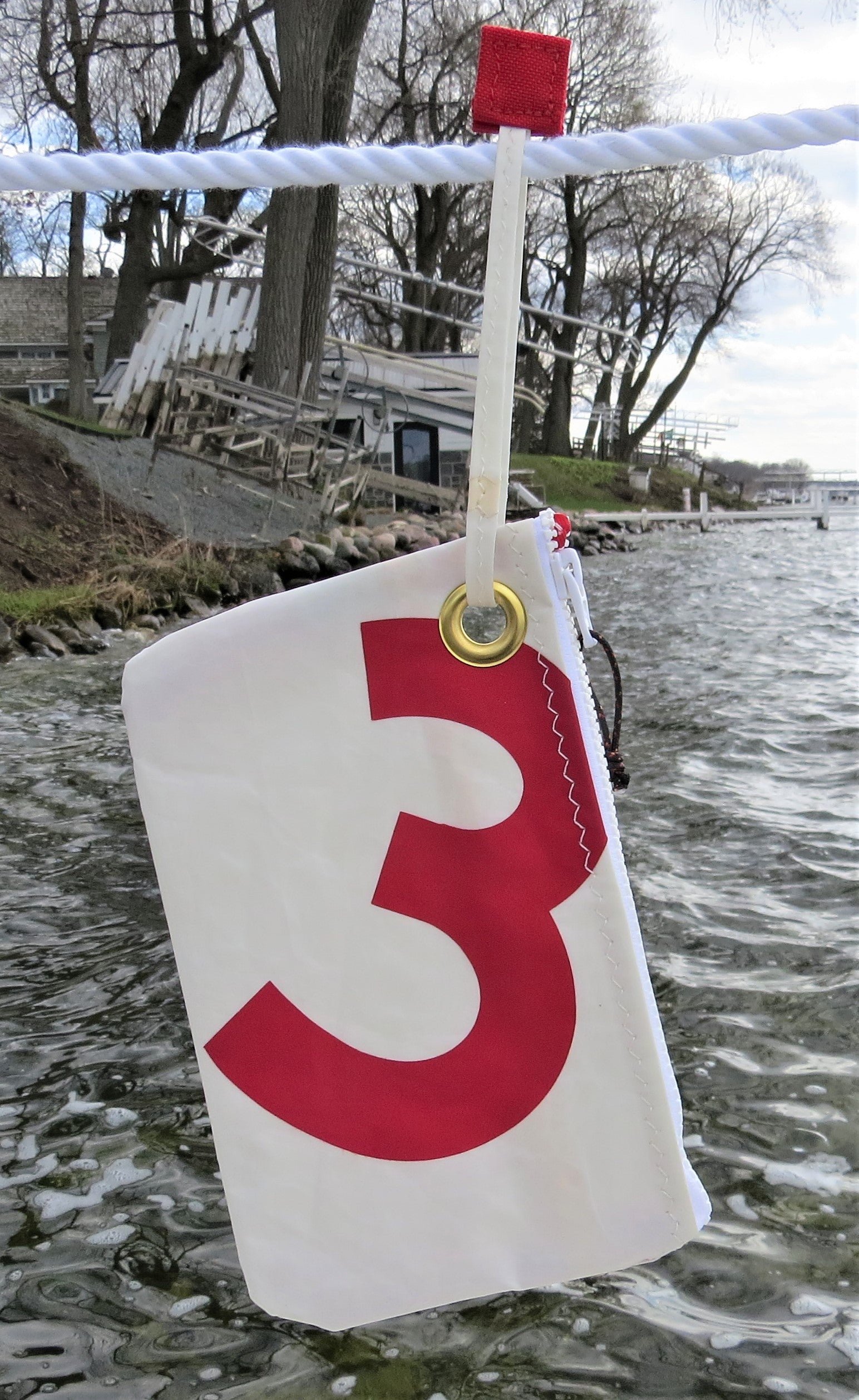 This No. 3 Wristlet is the perfect size, to hold your phone, and other essential items for the day or evening. It measures 8 x 51/2 with a 3" strap for convenience. The pouch is made with two layers of Dacron sail material to give it durability and stability. The strap is also made of Dacron sail material attached through a grommet with a gray Cordura® canvas tab at the end. The red no. 3 text is cut from adhesive material used for sail numbers.